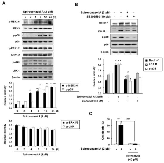 The p38 MAPK kinase signaling pathway is required in spiroconazol A-induced autophagic cell death. (A) After treatment with 2 μM of spiroconazol A for the indicated times, cells were examined by Western blot analysis. After pretreatment with 40 μM of SB203580 (p38 MAPK inhibitor), cells were treated with spiroconazol A for 24 h and then examined by (B) Western blot analysis and (C) PI staining, respectively. Experiments were repeated at least three times, and data are expressed as mean ± S.D. The relative optical density ratio was determined using a densitometric analysis program (Bio-Rad Quantity One® Software, version 4.6.3 (Basic), Bio-Rad Laboratories Inc., CA, USA), normalized to the internal control. * p < 0.05, ** p < 0.01, *** p < 0.001 vs. untreated A549 cells and # p < 0.05, ### p < 0.001 vs. spiroconazol A-treated A549 cells, by the Student’s t-test.