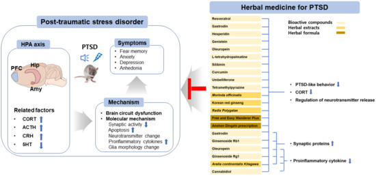 Therefore, in this review, we briefly describe how PTSD disturbs the HPA axis through molecular pathological changes in PTSD-related brain regions. We also summarize the possibility of treating PTSD with herbal medicines and the cellular and molecular mechanisms underlying the same in animal PTSD models.
