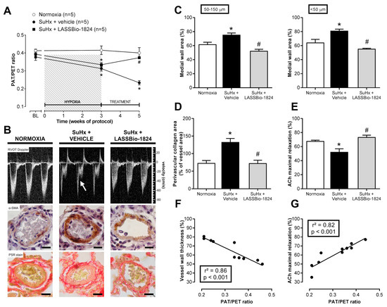 Effect of LASSBio-1824 on pulmonary vascular resistance and remodeling in SuHx. (A) Time course of pulmonary vascular resistance development after model induction and treatments (n = 5 rats per group). (B) Representative images of RVOT Doppler TTE, α-SMA immunostain and PSR stain of lung vessels. Arrow depicts a mid-systolic notch in pulmonary flux profile. Bars represent 20 μm. (C), Medial wall hypertrophy of lung vessels (n = 5 rats per group). (D) Perivascular fibrosis around lung vessels (n = 5 rats per group). (E) Maximal ACh-induced relaxation of pulmonary arteries (n = 5 rats per group). (F) Correlation analysis between endpoint pulmonary vascular resistance and wall hypertrophy. (G) Correlation analysis between endpoint pulmonary vascular resistance and endothelial function. ACh, acetylcholine; PAT, pulmonary acceleration time; PET, total ejection time; PSR, picro-Sirius red; RVOT, right-ventricle outflow tract; SMA, smooth-muscle actin; TTE, transthoracic echocardiography. * p < 0.05 compared to normoxia. # p < 0.05 compared to SuHx + Vehicle.