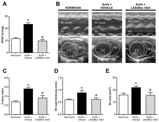 Effect of LASSBio-1824 on right-ventricle remodeling and hemodynamics in SuHx. (A) RV systolic pressures after treatment (n = 5 rats per group). (B) Representative images of cardiac structure by TTE. Traced lines depict ventricular endocardial surfaces. (C) Fulton index of hypertrophy of RV (n = 5 rats per group). (D) Echocardiographic measurement of RV wall hypertrophy (n = 5 rats per group). (E) Echocardiographic measurement of RV end-diastolic area (n = 5 rats per group). Ao, aorta; LV, left ventricle; RV, right ventricle; RVSP, right-ventricle systolic pressure; TTE, transthoracic echocardiography. * p < 0.05 compared to normoxia. # p < 0.05 compared to SuHx + Vehicle.