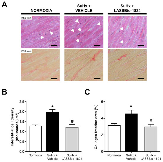 Impact of LASSBio-1824 on RV histology in SuHx. (A) Representative micrographs of RV sections with H&E and PSR stains. White arrowheads indicate interstitial cell nuclei. Bars represent 20 μm. (B) Interstitial cell density in RV tissue (n = 5 rats per group). (C) Red-stained collagen area of RV (n = 5 rats per group). H&E, hematoxylin-eosin; PSR, picro-Sirius red; RV, right ventricle. * p < 0.05 compared to normoxia. # p < 0.05 compared to SuHx + Vehicle.