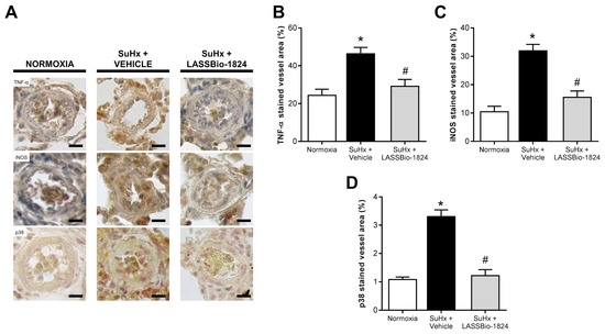 When compared to the normoxia group, lung immunohistochemistry in SuHx + vehicle rats revealed a significant increase in vascular protein content of important inflammatory mediators, such as TNF-α and iNOS, which resembled p38 MAPK expression (p < 0.05; Figure 5A–D). Oral treatment with LASSBio-1824 greatly attenuated vessel inflammatory marker content and p38 protein expression (p < 0.05; Figure 5A–D).