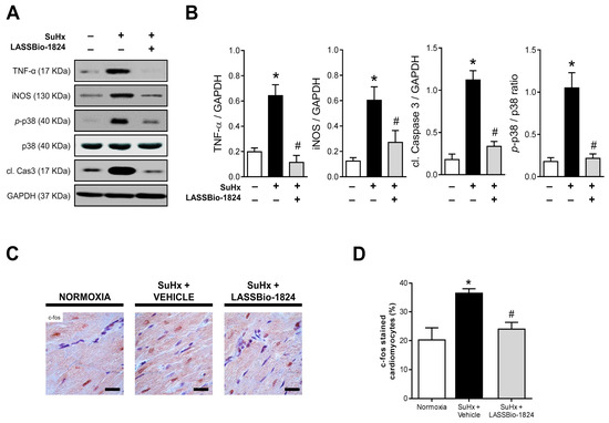 Furthermore, the increase in TNF-α and iNOS was reinforced by using Western blot analysis, and exacerbated activation of p38 and caspase 3 was observed in RV homogenates from vehicle-treated SuHx animals (p < 0.05; Figure 6A–B). LASSBio-1824 normalized the expression of inflammatory markers and caspase activation, matching the reduction seen in p38 phosphorylation (Figure 6A–B). Immunohistochemical staining displayed intense nuclear localization of c-fos in RV from SuHx + vehicle rats, possibly in response to higher cardiomyocyte stress (p < 0.05; Figure 6C,D) which was attenuated by LASSBio-1824. The reduction in the activity of this transcription factor in RV myocytes indicates possible inhibition of the early gene program and consequent cell dysfunction and apoptosis (p < 0.05; Figure 6C,D).