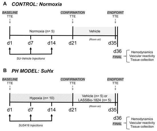 Model induction, therapeutic protocol and measurement schedules. (A) Control animals (n = 5) were maintained in room air (normoxia, FiO2: 21%) throughout the experimental protocol and received both weekly SU-vehicle (i.p.) and after 3 weeks, daily vehicle (DMSO, 100 μL p.o.). (B) SuHx animals were maintained in hypoxic chamber (FiO2: 10%) and received both weekly SU5416 (20 mg/kg i.p.) for 3 weeks and after return to normoxia, daily vehicle (DMSO, 100 μL p.o., n = 5) or LASSBio-1824 (50 mg/kg p.o., n = 5). TTE, transthoracic echocardiography.