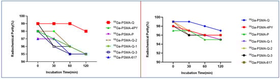 [68Ga]Ga-PSMA-4PY showed the highest hydrophilicity with, a log p value of −3.49 ± 0.01, followed by [68Ga]Ga-PSMA-Q (−3.24 ± 0.21), [68Ga]Ga-PSMA-Q-2 (3.14 ± 0.01), [68Ga]Ga-PSMA-Q-1 (−3.09 ± 0.19), [68Ga]Ga-PSMA-Q-3 (−2.99 ± 0.33), and [68Ga]Ga-PSMA-P (−2.77 ± 0.05). The hydrophilicity of all novel tracers was higher than that of [68Ga]Ga-PSMA-617 (log p = −2.54 ± 0.13). In addition, the hydrophilicity of these novel radiotracers was also compared with their retention times on radio-HPLC when the same mobile phase of 25/75 (v/v) acetonitrile/water containing 0.4% phosphoric acid at 1 mL/min was used. After incubation in PBS or 5% BSA at 37 °C for 2 h, the tracers were all stable in the two systems within the time tested (shown in Figure 2).