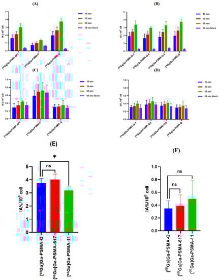 (A,B) Cell uptake of novel radiotracers in 22Rv1 cells. (C,D) Cell uptake of novel radiotracers in PC-3 cells. (E) Comparison of cell uptake of [68Ga]Ga-PSMA-Q, [68Ga]Ga-PSMA-11, and [68Ga]Ga-PSMA-617 in 22Rv1 cells at 60 min. (F) Comparison of cell uptake of [68Ga]Ga-PSMA-Q, [68Ga]Ga-PSMA-11, and [68Ga]Ga-PSMA-617 in PC-3 cells at 60 min p.i. (* p < 0.05).