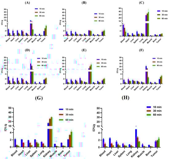 Uptake values for ex vivo tissues of (A) [68Ga]Ga-PSMA-Q, (B) [68Ga]Ga-PSMA-4PY, (C) [68Ga]Ga-PSMA-P, (D) [68Ga]Ga-PSMA-Q-1, (E) [68Ga]Ga-PSMA-Q-2, (F) [68Ga]Ga-PSMA-Q-3, (G) [68Ga]Ga-PSMA-617, and (H) [68Ga]Ga-PSMA-11 in 22Rv1 tumor-bearing mice (n = 3/time point).