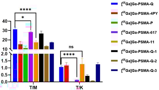 Tumor-to-muscle ratio (T/M) and tumor-to-kidney ratio (T/K) values of novel radiotracers and [68Ga]Ga-PSMA-617 (0.74 MBq/mouse) in 22Rv1 tumor-bearing mice at 60 min p.i. (n = 4/time point) (* p < 0.05, **** p < 0.0001).