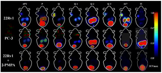 Based on the results of the cell experiments, we further explored the in vitro biodistribution and micro-PET imaging of three radiotracers in 22Rv1 and PC-3 tumor-bearing mice, and the results were compared with those of [68Ga]Ga-PSMA-617. The radiotracers accumulated rapidly in 22Rv1 tumors post-injection. The uptake of [68Ga]Ga-PSMA-Q was also the highest among the novel tracers, being similar to that of [68Ga]Ga-PSMA-617, followed by [68Ga]Ga-PSMA-11, [68Ga]Ga-PSMA-4PY, and [68Ga]Ga-PSMA-P. All of the tracers accumulated very little in PC-3 tumors. The micro-PET results were generally consistent with the biodistribution profiles. In most normal tissues and organs, the uptake of radiotracers—including [68Ga]Ga-PSMA-617 and [68Ga]Ga-PSMA-11—was at a low level and eliminated rapidly. With the passage of time post-injection, the 22Rv1 tumor-to-background ratio was increased, which was conducive to detecting 22Rv1 tumors in micro-PET images. The considerably high uptake in the kidneys was caused by both PSMA expression in the kidneys and the excretion of radiotracers from the kidneys. The SUVmax of [68Ga]Ga-PSMA-Q and [68Ga]Ga-PSMA-4PY in 22Rv1 tumors was equivalent to that of [68Ga]Ga-PSMA-617 and [68Ga]Ga-PSMA-11, and there was no significant difference (p > 0.05). [68Ga]Ga-PSMA-Q showed the highest 22Rv1 tumor-to-muscle ratio among all of the novel radiotracers—greater than that of either [68Ga]Ga-PSMA-617 or [68Ga]Ga-PSMA-11 (p < 0.05). Meanwhile, [68Ga]Ga-PSMA-P showed a poor imaging effect on 22Rv1 tumors, making it difficult to distinguish between tumor and background tissues.