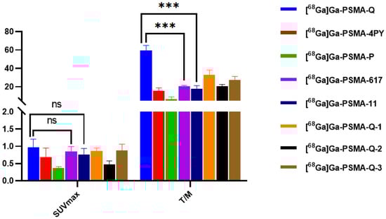 SUVmax of tumors and T/M values of novel tracers as well as [68Ga]Ga-PSMA-617 and [68Ga]Ga-PSMA-11 in 22Rv1 tumor-bearing mice at 60 min p.i. (*** p < 0.001).