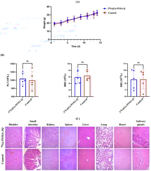 Radiotoxicity evaluation of [68Ga]Ga-PSMA-Q (37 MBq/mouse) in ICR mice (n = 5/group). (A) The weight changes of mice injected with [68Ga]Ga-PSMA-Q or saline (control) in the radiotoxicity study period. (B) Results of routine blood tests of mice in the [68Ga]Ga-PSMA-Q and control groups. (C) Results of H&E staining of the main organs (i.e., kidneys, heart, liver, spleen, salivary glands, small intestine, bladder, lungs) of mice in the [68Ga]Ga-PSMA-Q and control groups (WBC: white blood cell count, PLT: platelet count, RBC: red blood cell count. Values are expressed as the mean ± SD; n = 10; ns: not statistically significant).