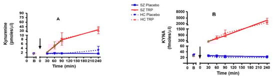 In view of the growing interest in the hypothesis that TRP metabolites, such as KYNA, play a significant role in the pathophysiology of SZ and of the still unresolved question as to whether the measurement of circulating metabolites can provide critical insights in this respect, we conducted a double-blind, placebo-controlled, crossover study to compare blood levels of three key metabolites of the two major branches of TRP degradation (kynurenine, KYNA and 5-HIAA) at rest and after an oral TRP challenge in healthy controls (HCs) and people with SZ to examine whether there are group differences in the conversion of TRP to serotonin or KP metabolites.