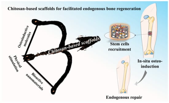 In this review, we mainly focus on the recent advances in chitosan-based scaffolds for facilitated endogenous bone regeneration (Figure 1). Initially, two bone repair strategies, FEBTE and BTE, are introduced and compared. Subsequently, CS sources, CS-based composite scaffolds and their fabrication techniques are briefly introduced. Furthermore, the functional designs of CS-based scaffolds in bone endogenous regeneration, including the loading of biomolecules, hybridization with inorganic nanomaterials and exogenous physical stimulation are highlighted and discussed in detail. Finally, the major challenges and further research directions of CS-based scaffolds are also elaborated. We hope that this review will provide valuable reference for further bone repair research in the future.