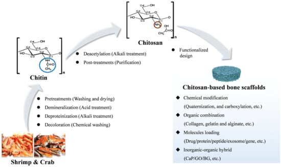 CS, as a renewable source, is mainly derived from chitin that is found in the shell structure of marine shrimps and crabs [] (Figure 3). Seafood processing factories throw away countless crustacean shells every day, resulting in huge waste of resources and environmental pollution. Research has found that the content of chitin in these shells is as high as 30%. As a business opportunity, investors can make high-value utilization of these valuable wastes through chemical extraction processes [,]. According to statistics, the global chitosan market size is expected to reach 4.7 billion dollars in 2027 [].