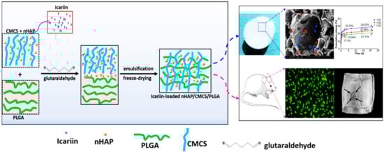 The preparation process of icariin-loaded HAP/CMCS/PLGA scaffolds and the application for cranial defects repair Reprinted with permission from ref. []. Copyright 2020 Chem. Eng. J.