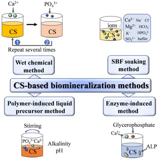 However, HAP mixed directly with organic polymers might lead to the aggregation of inorganic nanoparticles into the polymer matrix, which can weaken the stability and bioactivity of the scaffolds []. In order to mimic the biomineralization process of natural bone tissue, biomimetic mineralization technology is gaining increasing interest among researchers []. Therein, a CS-based organic matrix as a template to regulate the growth of HAP has been correspondingly fabricated []. As shown in Figure 5, a summary of past research found that there are four mineralization methods to fabricate a CS-based HAP hybrid scaffold, including the wet chemical method [,], simulated body fluid [,], polymer-induced liquid precursor method [,] and alkaline phosphatase (ALP)-induced method []. These methods have their own characteristics. Among them, the preparation conditions of the ALP-induced method are relatively mild. In recent years, the research on mixing glycerophosphate and ALP to induce mineralization in hydrogels has gradually increased []. The phosphate groups in glycerophosphate turn to free phosphate groups under the action of ALP, and the calcium salt in the soaking solution is combined with free phosphate groups to form HAP nanoparticles [].