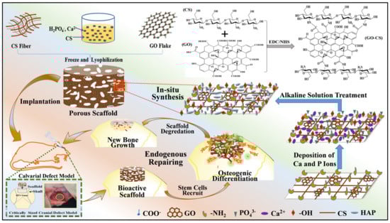 The GO/CS/HAP scaffold prepared by in situ mineralization strategy is used for endogenous bone regeneration. Reprinted with permission from ref. []. Copyright 2020 Chem. Eng. J.