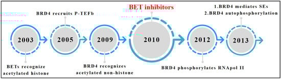 The first study to report a clear connection between BETs and transcriptional regulation via their recognition of and interaction with acetylated histones was published in 2003 [14]. Further, numerous studies confirmed that BETs play a key role in transcriptional regulation. In 2005, two independent groups reported that BRD4 recruits positive transcription elongation factor b (P-TEFb) to the promoter of target genes [4,16]. P-TEFb is a heterodimer composed of cyclinT1, T2, and cyclin-dependent kinase 9 [4,16]. Upon recruitment to the promoter by BRD4, P-TEFb phosphorylates RNA polymerase II (RNAPII) inducing transcription in vivo [4,16]. In addition to recruiting P-TEFb, BET protein BRD4 also acts as an atypical kinase binding the carboxyl-terminal domain of RNAPII directly phosphorylating its serine 2 [17] and has also been shown to recognize non-histone acetylation [18]. Huang et al. reported that BRD4 binds to acetylated lysine-310 within the RelA subunit of nuclear factor (NF)-κB and enhances transcriptional activation of NF-κB and a subset of NF-κB-responsive inflammatory genes [18]. In 2013, Young et al. proposed the concept of the super enhancer, which differs from typical enhancers in size, transcription factor density and content, ability to activate transcription, and sensitivity to perturbation [19,20]. This group also identified BRD4 as a critical supporting partner for the establishment of several super enhancers known to drive the expression of various key genes associated with multiple myeloma [19]. Subsequently, other studies also reported that BRD4 is a key co-transcription factor in super enhancer-mediated gene expression across multiple biological processes [21,22]. BRD4 not only functions as a negative cotranscription factor but also a target that is positively phosphorylated or dephosphorylated by kinase or phosphatase, respectively. Wu et al. reported that casein kinase II-mediated phosphorylation of a conserved acidic region in BRD4 modulates its association with P53, modulating the expression of various P53 target genes [23]. In addition, Shu et al. found that hyper-phosphorylation of BRD4 is closely associated with resistance to BET inhibitors in triple-negative breast cancer [24]. In addition, BRD4 phosphorylation has also been shown to be involved in various cognitive activities, such as memory formation and extinction [25] (Figure 1).