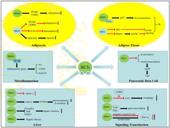 Epigenetic modulation involves the addition (writing) or removal (erasing) of histone modifications across the chromatin to facilitate changes in the heterochromatin allowing its transition into the open, activated euchromatin state necessary for transcription [1,2]; Lysine acetylation has emerged as an important and widespread regulatory posttranslational modification in several key proteins, including, the modification of various lysine sidechains within the unstructured amino-terminal tail of various histone proteins [1,2,3]. This process is closely associated with transcriptional regulation and is a key target in the evaluation of epigenetic diseases [3]. The bromodomain extra terminal (BET)- family of epigenetic reader proteins, including BRD2, BRD3, BRD4, and BRDT (hereafter referred to as BETs), regulate gene transcription via their recognition and binding of acetylated histones [4,5]. Given this critical role, BETs were treated as both a plausible and important therapeutic target, and investigations of these proteins facilitated the development of two sets of BET inhibitors in 2010 [6,7]. The development of these chemical BET inhibitors greatly facilitated and accelerated the study of BET family proteins, with several investigations revealing their close association with metabolic signaling [8,9,10] and diseases [11,12]. Therefore, we designed this review to evaluate the pathophysiological roles of these proteins in both normal metabolic processes and their disorders.