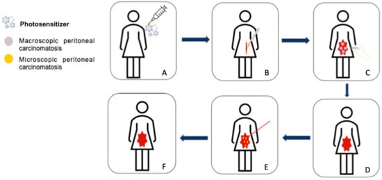 Intraperitoneal photodynamic therapy protocol for peritoneal metastases of advanced ovarian cancer. (A) Administration of the photosensitizer, (B) open approach (laparotomy) to perform macroscopic complete cytoreductive surgery, (C) cytoreductive surgery (hysterectomy, bilateral adnexectomy, omentectomy, appendectomy +/- pelvic and para-aortic lymphadenectomies, removal of all visible peritoneal metastases), (D) end of the cytoreductive surgery, (E) illumination of the peritoneal cavity to treat by photodynamic therapy microscopic peritoneal metastases, (F) end of the procedure.