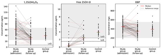 Dynamic evaluation of active vitamin D metabolite (1,25(OH)2D3), free 25OH-D, and vitamin D-binding protein (DBP) concentrations in patients with COVID-19 and comparison to the reference group. Data are shown as individual values. Limits of blank (LoB), detection (LoD), and quantitation (LoQ) are shown. Red dotted lines correspond to patients with a severe course of COVID-19.