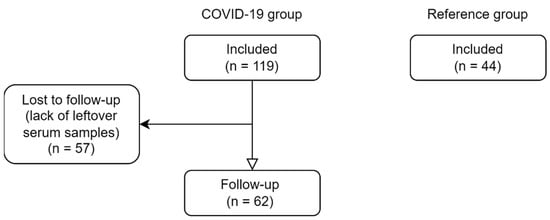 This was a retrospective cohort study based on a single-center experience. The main cohort included 119 adult patients hospitalized at the COVID-19 patient care hospital based in Moscow, Russia, for inpatient treatment during the period from 5 May to 4 June 2020. Diagnosis and inpatient treatment of COVID-19 patients was performed according to temporary federal guidelines []. COVID-19 was diagnosed with at least one of the following features in the presence of clinical findings suggestive of COVID-19: positive PCR nasal swab, positive PCR throat swab, a characteristic pattern of changes on chest CT. The severe course of the disease was defined within the framework of the current study as at least one of the following features: prescription of immunobiological treatment, either admission or transfer to the intensive care unit, fatal outcome. Recruitment of patients was carried out throughout the entire period of operation of the COVID-19 patient care hospital in a continuous manner, except for patients with insufficient residual serum for the planned laboratory measurements.