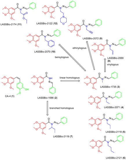 Structures of CA-4 (1), LASSBio-1586 (2) and compounds 3–12 designed using homologation strategy on the nitrogen of N-acylhydrazone framework.