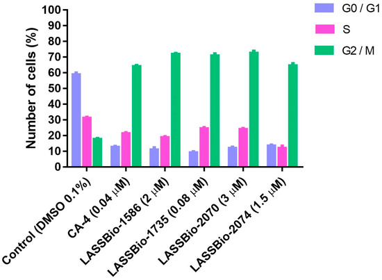 Effects of compounds treatment on G2/M phase arrest in H1975 cells. The cell cycle distribution after 48 h of treatment with CA-4 (1, 0.04 µM), LASSBio-1586 (2, 2.0 µM), LASSBio-1735 (3, 0.08 µM), LASSBio-2070 (10, 3.0 µM) and LASSBio-2074 (11, 1.5 µM), compared with the control (DMSO 0.1%), was measured using flow cytometry. The data are presented as mean values ± SD, obtained by at least three independent experiments performed in triplicate, the data being compared with the negative control by ANOVA followed by the Newman Keuls test in all phases with p < 0.05.