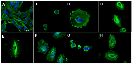 Antitubulin agents have been broadly classified into destabilizing or stabilizing agents, based on their interference with the dynamic balance of polymerization or depolymerization of microtubules [19]. To elucidate the cellular mechanism of action of LASSBio-1586 (2, 10 µM), LASSBio-1735 (3, 0.5 µM), LASSBio-2070 (10, 4.5 µM), and LASSBio-2074 (11, 20 µM), first identified as antimitotic agents (Figure 4), we performed immunofluorescence studies aiming to identify the morphological changes on the cytoskeleton of H1975 cells in the presence and absence of the target compounds. CA-4 (1, 0.3 µM), vincristine (0.5 µM) and taxol (0.1 µM) were used as standard controls. Compounds were assayed at a concentration two times higher than their CC50 to demonstrate their effect on the cells.