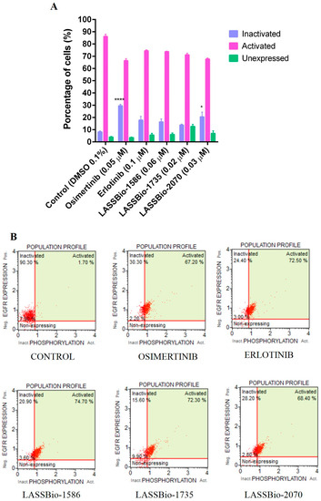 Due to the good potency of the compounds on human lung adenocarcinoma cell lines overexpressing EGFR receptors, we decided to investigate the possibility of these compounds to modulate the activity of those receptors. To address this question, the selected compounds were assayed using the Guava Muse® EGFR-RTK Activation Dual Detection Kit protocol. The experimental was performed on non-small cell lung cancer PC-9 cells that express the EGFRL858R phenotype by flow cytometry analysis. Compounds were assayed using a single concentration based on their CC50 values on PC9 determined by the 48 h MTT method (Table 4). Osimertinib (EGFR irreversible inhibitor) and erlotinib (EGFR reversible inhibitor) were used as standard drugs, with concentrations of 0.05 µM and 0.1 µM, respectively. As demonstrated in Figure 5, erlotinib (a first-generation inhibitor of EGFR) as well as LASSBio-1586 (2, 0.06 µM), LASSBio-1735 (3, 0.02 µM) and LASSBio-2070 (10, 0.03 µM), exhibited a comparable EGFR inactivation index, although only the result for the benzyl homolog 10 was statistically significant. Osimertinib, a third-generation EGFR inhibitor that has been reported as a potent and selective inhibitor of EGFR mutations forms (i.e., L858R and L858R/T790M) [28], exhibited a superior EGFR inactivation index (30%). Taken together, the results indicate LASSBio-2070 (10) as able to modulate EGFR activity in a phenotypic model by inhibiting the phosphorylation of EGFR on PC-9 cell line (Figure 5). Therefore, its binding mode with EGFR was investigated by molecular docking and is further discussed later.