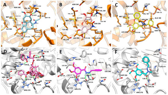 Analysis of the interaction mode in (A) colchicine in sky blue; (B) CA4 in pink; and (C) LASSBio-2070 (11) in yellow at the colchicine binding site (PDB: 5XIW). Protein carbon atoms are represented in orange, oxygen in red, nitrogen in blue and the distances between hydrogen bonds are represented by the green line. Hydrophobic interactions are represented by orange lines. Analysis of the interaction mode in (D) taxol in hot pink; (E) LASSBio-1586 (3) in magenta; (F) and LASSBio-1735 (3) in cyan at the taxol binding site (PDB: 6WVR). Protein carbon atoms are represented in gray, oxygen in red, nitrogen in blue and the distances between hydrogen bonds are represented by the green line. Hydrophobic interactions are represented by orange lines.