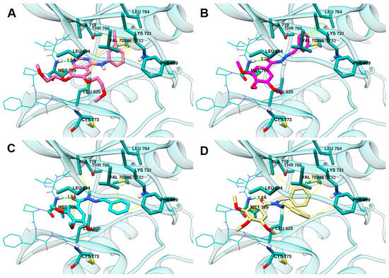 Analysis of the interaction mode in (A) erlotinib in pink, (B) LASSBio-1586 (2) in magenta, (C) LASSBio-1735 (3) in cyan, and (D) LASSBio-2070 (10) in yellow, at the ATP binding site (PDB: 1M17). Protein carbon atoms are represented in light blue, oxygen in red, nitrogen in blue and the distances between hydrogen bond are represented by the green line. Hydrophobic interactions are represented by yellow lines.
