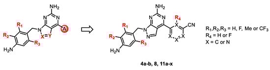 For the synthesis of compounds 4a and 4b, the core bicyclic ring was synthesized directly using hydrazine (Scheme 1). The core scaffold, 1H-pyrazolo[3,4-d]pyrimidin-6-amine, was generated through ring condensation by reacting hydrazine with 2-amino-4,6-dichloropyrimidine-5-carboxaldehyde. Since the pyrimidine reagent has two chloro atoms symmetrical on both sides, the resulting hydrazine obtained after condensing with aldehyde reacts with any chloro group on both sides of the pyrimidine to obtain the same intermediate 2. The chlorine of compound 2 was substituted with 3-benzonitrile groups by Suzuki coupling, and then nitro reduction with iron dust provided the final compounds.