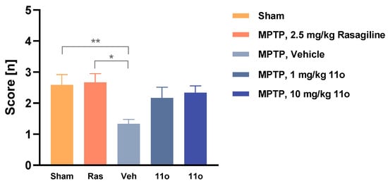 Nest-building score of sham or MPTP-lesioned mice treated either with vehicle, rasagiline or compound 11o (intranasal). The graph presents the mean nesting scores ± SEM (n = 12 rats per group). Data were analyzed using the Kruskal–Wallis test and Dunn’s multiple comparison test (all mean values were compared to MPTP, vehicle). * p < 0.05 and ** p < 0.01.