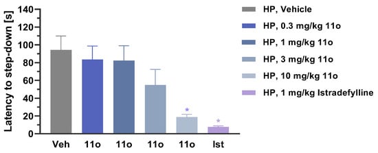 Latency to step-down in female rats injected with haloperidol (HP). Rats were administered with 11o (PO) 60 min before haloperidol injection at increasing dose levels. Istradefylline (1 mg/kg, PO) was used as positive control. The graph presents the mean latency (seconds) ± SEM (n = 10 rats per group). Data were analyzed using the one-way ANOVA with Dunnett’s multiple comparisons test (all mean values were compared to vehicle). * p < 0.01.
