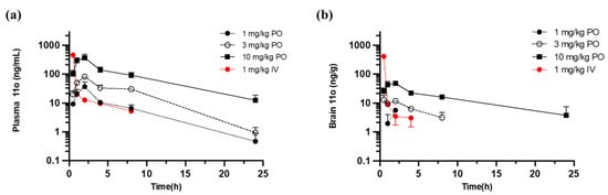 Plots showing the mean concentrations of 11o versus time in mouse plasma (a) and brain (b). 11o was administered either orally (PO) or intravenously (IV). Three mice were sampled from each group for blood and brain collection at each time point. Plasma and brain samples were analyzed for 11o concentrations using LC–MS/MS.