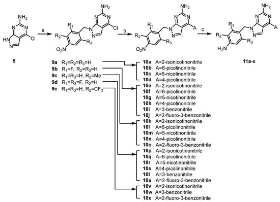 For the synthesis of compounds 11a-11x, intermediate 5 was first alkylated with the corresponding benzyl halides, and then substituted phenyl/pyridyl was incorporated by Pd-catalyzed cross-coupling in a different order from Scheme 3. For ortho-substituted cyanopyridyls (A1 and A2, Table 1), classic Suzuki, Stille and Negishi coupling did not work well due to strong electron deficiency. This deficit was resolved by applying Pd-catalyzed desulfination coupling [9,10]. Finally, nitro reduction with iron dust provided the final products. Notably, during nitro reduction, the cyano group of pyridyl was also reduced in Fe/NH4Cl and then readily hydrolyzed. A similar observation was recorded under Pd/C hydrogenolysis conditions. However, the problem was solved by shortening the reduction time in Fe/NH4Cl, and the reaction was generally completed within 1 h. All final compounds were efficiently purified to >95% purity using normal phase prep-HPLC.