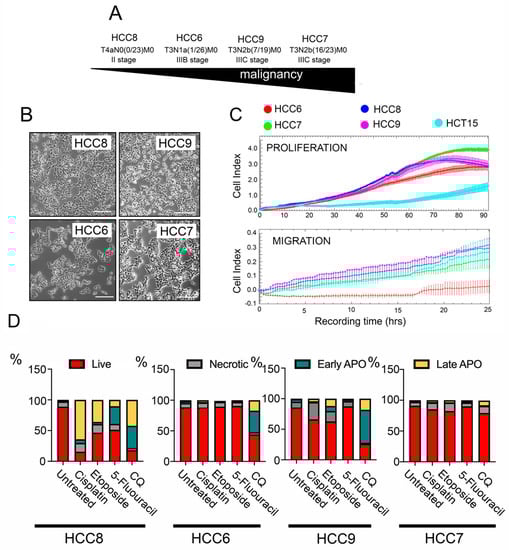 Proliferative migratory properties of human colon carcinoma (HCC) cells and sensitivity to anticancer drugs. (A) Arrow demonstrating the level of malignancy of human colon carcinoma (HCC) cells according to medical diagnosis. (B) Images demonstrating the morphology of HCC cells. (C) Proliferation and migration of HCCs measured with the aid of an xCELLigence real-time cell analyzer. E-plates were used for the proliferation assay shown in the upper graph and CIM-plates for migratory experiments (lower graph). An established cell line of the same histogenesis, HCT-15, was used for standardization. (D) Apoptosis in HCC cells incubated with 10 µM of cisplatin, 25 µM of etoposide, 500 µM of 5-fluorouracil, and 200 µM chloroquine for 48 h. The apoptosis level was measured with the aid of flow cytometry. After treatment, cells were stained with Annexin V Alexa 647 and propidium iodide (PI). Flow cytometry diagrams are presented in Figure S1.