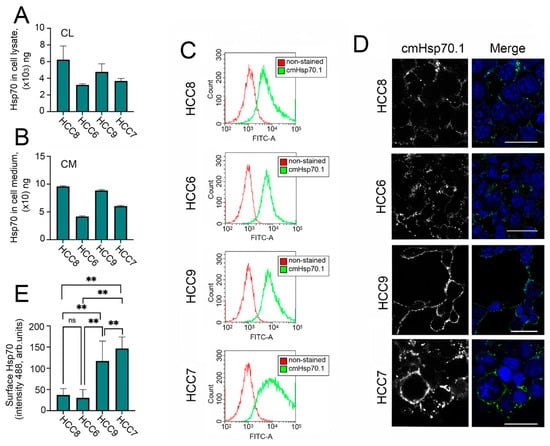 There is much data in the literature indicating a correlation between the intracellular and extracellular levels of Hsp70 and the degree of tumor aggressiveness [13], therefore, we evaluated the amount of (i) intracellular Hsp70, (ii) Hsp70 expressed on the cell surface, and (iii) extracellular Hsp70. To assess intracellular and extracellular Hsp70, we used a recently published Hsp70-ELISA [17]. Using this method, we showed that all HCC cells have high Hsp 70 levels but the most malignant HCC7 (IIIC stage) and HCC6 (IIIB stage) cell lines contain lower amounts of Hsp70 in their cell lysates (CL) and export larger amounts of the chaperone to the cell media. The highest levels of Hsp70 in CL and CM were observed in non-invasive HCC8 cells and HCC9 cells (Figure 2A,B). Importantly, cells of all four lines secreted a high amount of HSP70 into the medium, reaching tens of nanograms, and the variance of this parameter generally corresponded to the amounts of intracellular protein.We did not find any correlation between the degree of malignancy and Hsp70 expression, probably due to the small sample size.