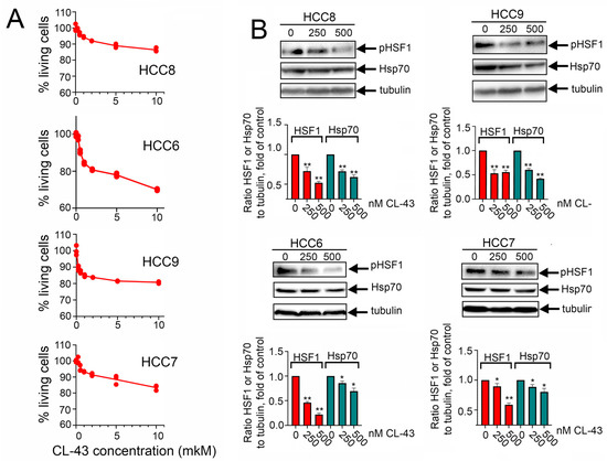 Since primary tumor cells demonstrated high resistance to antitumor drugs, we considered enhancing their sensitivity with the help of the previously identified HSF1 inhibitor, CL-43 [19,20]. First, we measured the viability of patients’ cells treated with CL-43 in various concentrations using an MTT assay. We found that after 24 h of incubation in a concentration of 10 μM (that is 20-fold higher than the earlier administered dose) 86.4 ± 0.7% of cells survived in the HCC8 population, 70.1 ± 0.3% in HCC6, 80.8 ± 0.3% in HCC9, and 83.4 ± 0.9% in the HCC7 population. The low toxicity of CL-43 is combined with its inhibitory effect on the cell cycle which was illustrated in Figure S2.