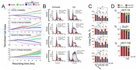 Finally, to make sure that the therapeutic effect obtained for all four primary cell lines extends to other cancer cells of the same histogenesis, we additionally studied the effect of CL-43 in combination with CQ on three established colon cancer cell lines. HCT-15, DLD1, and HCT-116 cells were treated with CL-43 (250 nM) and CQ (60 µM) separately or in combination, and the apoptosis level was determined using flow cytometry. We did not find any CL-43 toxicity compared with untreated cells in all three lines, however, if employed in combination with CQ, CL-43 reduced the proportion of living cells to 3.8% for HCT-15 cells, 11.8% for DLD1, and 44.8% for HCT-116 (Figure 4D).