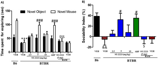 Effects of ST-2223 on the sociability deficits of BTBR mice in sociability approach test. (A) B6 and BTBR mice spent time for exploring novel object/novel mouse. (B) Sociability index (SI). *** p < 0.001 compared to VEH-treated B6 mice. # p < 0.05, ### p < 0.001 compared to VEH-treated BTBR mice. $ p < 0.05, $$$ p < 0.001 compared to ST-2223-(5 mg)- pretreated BTBR mice. && p < 0.01 compared to VEH-treated B6 mice. Data are expressed as the mean ± SEM (n = 7).