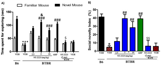 The effects of intraperitoneal chronic administration of three different doses of ST-2223 (2.5, 5, and 10 mg/kg) and ARP (1 mg/kg) on the time spent with the familiar mouse (FM) and the novel mouse (NM) are shown in Figure 2. The results of post hoc analyses indicated that control B6 mice showed significant interactions with NM vs. FM, with [F(1,12) = 42.36; p < 0.001] (Figure 2A). As seen in Figure 2A and following post hoc analyses, BTBR mice spent less time for exploring NM, with [F(1,12) = 67.42; p < 0.001], as compared to B6 control mice. However, BTBR mice pretreated with ST-2223 (5 and 10 mg/kg, i.p.), ARP (1 mg/kg) showed enhanced preference to stranger NM over FM [F(1,12) = 72.02; p < 0.001], [F(1,12) = 25.67; p < 0.001], [F(1,12) = 72.36; p < 0.001], respectively (Figure 2A) and when compared to VEH-treated BTBR mice. Moreover, ST-2223 (5 mg/kg) provided significantly higher improvement of social novelty preference than that witnessed with ST-2223 (2.5 mg/kg), with [F(1,12) = 57.36; p < 0.001]. Furthermore, no significant difference was observed between control B6 and ST-2223 (5 mg) treated mice in exploratory time for NM (p = 0.37) (Figure 2A). Similar to the results observed on the ST-2223—provided effects on sociability, the ST-2223-provided effect on social novelty preference was completely reversed by co-administration of H3R agonist RAM [F(1,12) = 57.93; p < 0.001] (Figure 2A).