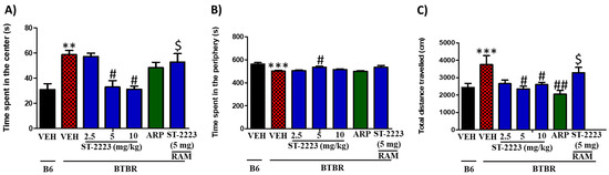 OFL test was employed to evaluate the effects of the applied three doses of ST-2223 on the anxiety-like behaviors and locomotion of treated mice (Figure 3A–C). As shown in the results observed in Figure 3A, BTBR mice exhibited significantly more time in the center of the arena [F(1,8) = 16.55, p < 0.01] when compared with control B6 mice. Analyses of variances revealed that the BTBR mice when treated with ST-2223 (5 and 10 mg/kg, i.p.) expended significantly less time in the central compartment of the open field, with [F(1,8) = 10.85, p < 0.05] and [F(1,12) = 7.39, p < 0.05], respectively (Figure 3A). However, systemic chronic treatment with the lower (2.5 mg/kg) dose of ST-2223 failed to decrease the time spent in the center of the arena to a significant level, with [F(1,8) = 0.02, p = 0.84] (Figure 3A). As shown in the results observed for the time spent in the periphery, BTBR mice exhibited a significant decrease in the time spent in the periphery, with [F(1,8) = 16.96, p < 0.001] (Figure 3B). However, and like the results observed for the time spent in the center of the arena, treatment with ST-2223 (5 mg/kg, i.p.) significantly corrected the decreased time [F(1,8) = 10.65, p < 0.05), and as compared with BTBR mice. Notably, after ST-2223 (2.5 and 10 mg/kg, i.p.) as well as ARP (1 mg/kg, i.p.) treatments, there were no group differences in modulating the time spent by BTBR mice in the periphery, with [F(1,8) = 1.82, p = 0.21] and [F(1,8) = 0.05, p = 0.83], respectively (Figure 3B). Interestingly, chronic systemic co-administration of BTBR with RAM (10 mg/kg, i.p.) reversed the ST-222(5 mg)—provided effects on time spent in the center, with [F(1,8) = 0.65, p = 0.44]], for the comparison of ST-2223(5 mg) + RAM(10 mg)- treated group with saline-treated BTBR control mice (Figure 3A). Additionally, the results observed showed that the total distance travelled by BTBR mice was significantly higher when compared to control B6 mice, with [F(1,8)= 32.96, p < 0.001]. However, ST-2223 (5 and 10 mg/kg) and ARP (1 mg/kg) significantly decreased the total distance travelled, with [F(1,8)= 6.79, p < 0.05], [F(1,8)= 5.48, p < 0.05], and [F(1,8)= 9.33, p < 0.01], respectively, and as compared to VEH-treated BTBR mice (Figure 3C).