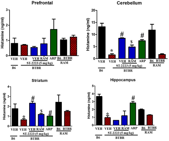 Estimation of histamine levels by LC-MS/MS in different brain regions of BTBR. * p < 0.05 compared to VEH- treated B6 mice. # p < 0.05 compared to VEH-treated BTBR mice. $ p < 0.05 compared to ST-2223-(5 mg)-treated BTBR mice. Data are expressed as the mean ± SEM (n = 5).