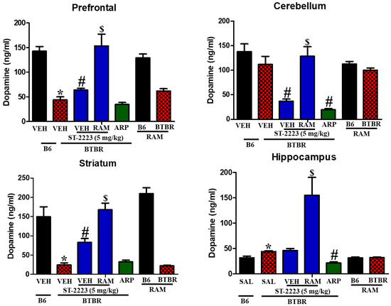 Moreover, the levels of dopamine were evaluated in the same regions of treated BTBR mice (Figure 5). The observed results showed that dopamine levels in the control mice were significantly higher than that assessed in brain regions of BTBR mice, and this is specifically in prefrontal cortex [F(1,8) = 69.41; p < 0.05] and striatum [F(1,8) =27.41; p < 0.05] (Figure 5). However, administration of ST-2223 (5 mg/kg) significantly increased the dopamine levels in both regions of tested BTBR mice, with ([F(1,8) = 8.21; p < 0.05] and [F(1,8) = 26.17; p < 0.05], respectively. Unexpectedly, chronic systemic administration with H3R agonist RAM failed to reverse the ST-2223-provided increase on dopamine levels, but rather significantly further increased the enhanced levels measured for dopamine in ST-2223-pretreated BTBR mice, with [F(1,8) = 17.24; p < 0.05] and [F(1,8) = 19.40; p < 0.05], respectively.