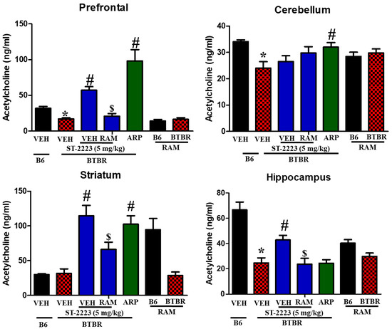 The levels of acetylcholine were shown in the four assessed brain regions of BTBR mice (Figure 6). The results observed clearly that acetylcholine levels were significantly lower in BTBR mice compared to control B6 mice, particularly in prefrontal cortex, cerebellum, and hippocampus tissues, with [F(1,8) = 23.89; p < 0.05], [F(1,8) = 11.57; p < 0.05], and [F(1,8) = 32.45; p < 0.05], respectively (Figure 6). However, and following chronic systemic administration of BTBR mice with ST-2223 (5 mg/kg), a significant increase of acetylcholine levels in prefrontal cortex [F(1,8) = 49.99; p < 0.05], striatum [F(1,8) = 34.55; p < 0.05], and hippocampus [F(1,8) = 11.24; p < 0.05] were witnessed. Similarly, the reference drug ARP (1 mg/kg) demonstrated a signified increase in the levels of acetylcholine in the prefrontal cortex, cerebellum, and striatum tissues, with [F(1,8) = 26.34; p < 0.05], [F(1,8) = 7.45; p < 0.05], and [F(1,8) = 22.89; p < 0.05], respectively, and these enhancements were entirely nullified following systemic chronic co-administration with the CNS-penetrant H3R agonist RAM (10 mg/kg), with [F(1,8) = 27.74; p < 0.05], [F(1,8)= 7.55; p < 0.05], and [F(1,8) = 10.18; p < 0.05], respectively, and as compared with brain regions of ST-2223 (5 mg)- treated BTBR mice (Figure 6). Table 2 summarizes the overall effects observed for the test compound ST-2223 and the reference drug ARP on histamine, dopamine, and acetylcholine in brain regions of the assessed mice (Table 2).