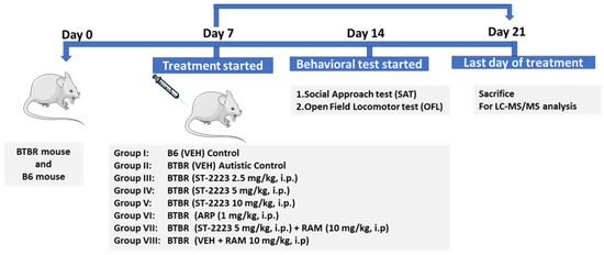 All the mice were randomly divided into nine groups of 5–7 mice each. The mice were injected intraperitonially once daily for 21 days with different doses of ST2223 (2.5, 5, and 10 mg/kg, i.p.), ARP 1 mg/kg or vehicle (1% DMSO in 0.9% normal saline). Group I, B6 mice were injected with vehicle served as control. Group II, BTBR mice were treated with vehicle. Groups III–V, BTBR mice received i.p. injections of different doses of ST2223 (2.5, 5, and 10 mg/kg, i.p.), respectively. Group VI, BTBR mice were injected with ARP (1 mg/kg, i.p.). For abrogation studies, Group VII, BTBR mice were treated with ST2223 (5 mg/kg, i.p.) along with RAM (10 mg/kg, i.p.). Group VIII, B6 mice were co-injected with vehicle and RAM (10 mg/kg, i.p). All treatments and vehicle (VEH) were administered 30–45 min before each behavioral test. The doses of these drugs were selected based on previous reports [15,75]. Behavioral testing was performed between 9:00 am and 3:00 pm in an order randomized by group and in the following sequence: social approach test (SAT) and open field locomotor test (OFL). The chronic treatment started one week before the behavioral test and was continued for a total of 21 days as described above (Figure 7). Following behavioral tests, i.e., on day 21 of systemic treatment, five of the animals were sacrificed. The animals were deeply anesthetized with pentobarbital (40 mg/kg, i.p., body weight). To wash out the blood, cardiac perfusion was carried out using 0.01 M phosphate-buffered saline (PBS) at pH 7.4. The brains were quickly removed and placed on an ice plate, where the cerebellum, hippocampus, prefrontal cortex, and striatum were excised from the brain and snap-frozen in liquid nitrogen for later LC-MS/MS analysis [17,44].