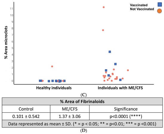 (A) Representative fluorescence micrographs of fibrinaloid microclot presence in PPP from controls and individuals with ME/CFS. Each image represents an individual sample. Images were taken at 63× machine magnification. (B) Fluorescence micrographs showing the fibrinaloid microclot scoring system used to define the load of fibrinaloid microclot severity in platelet-poor plasma (PPP). This scoring system was developed to assign a quantitative score to qualitative data. Stage 1 shows minimal fibrinaloid microclot formation as seen in healthy/control PPP, whereas Stage 4 represents a severe fibrinaloid microclot load. The bottom row represents examples of stage 4 microclots using (micrograph A) bright-field microscopy, (micrograph B) fluorescence microscopy, and (micrograph C) an overlay of fluorescence and bright-field microscopy [45]. All images within a row are a reflection of the same score. (C) Mean % area of amyloid signal between control and ME/CFS groups represented as a strip plot. The COVID vaccination status of individuals is color-coded and vaccinated participants are indicated with a blue block and those not vaccinated with an orange circle. (D) Mean % area amyloid/fibrinaloid signal between control and ME/CFS groups. A Mann–Whitney analysis yielded a significant difference (****) (p < 0.0001), with the ME/CFS group exhibiting a greater mean (1.37) than that of the controls (0.10). Statistical significance was recorded at p < 0.05. (* = p < 0.05; ** = p < 0.01; *** = p < 0.001).