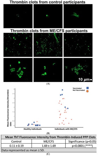 (A) Representative micrographs showing thrombin-induced fibrin networks stained with ThT from healthy participants and participants with ME/CFS. Each micrograph represents an individual sample. Images were taken at 63× machine magnification. (B) Strip plot showing the difference in mean fluorescence signal between control (0.11 ± 0.19) and ME/CFS (1.69 ± 1.69) PPP fibrin amyloid networks induced by exogenous thrombin. Vaccinated participants are indicated with a blue block and those not vaccinated, with an orange circle. (C) Mean fluorescent intensity of ThT signal from thrombin-induced PPP clots. A significant difference (****) between ME/CFS (1.69 ± 1.69) and controls (0.11 ± 0.19) was determined by a Mann–Whitney test. Statistical significance was recorded at p < 0.05.